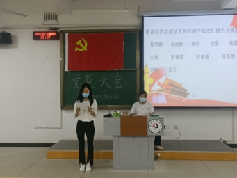 全体起立,奏唱国歌后。我支部向大会报告了对发展对象杨李娜等13名同志的审查情况及结果。随后13位发展对象按顺序向支部大会宣读入党志愿书,并汇报了个人在思想学习、对党的认识等方面的情况。