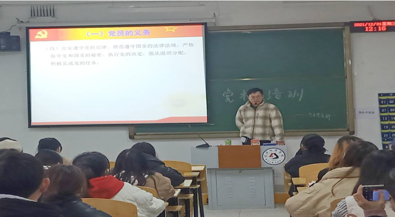 12月1日中午12:10-1:30在5-115教室,管理公司的丁浩老师为我们讲授了以“党员的权力与义务”为主题的党课。丁浩老师以《中国共产党党章》为依据,为我们讲解了中国共产党党员所具备的八项权利与八项义务。使我们们更加明白如何做好一名合格的中国共产党党员。