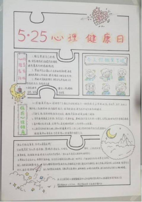 为了迎接“5.25老员工心理健康日”的到来,也为了提高同学们的创新思维能力,激发同学们对书法、绘画、文学等技能的学习热情,和对心理健康焦点问题的关注,调动同学们的积极性,开阔员工的视野,体味世界的丰富多彩,william威廉中文官网心理协会特地策划举办了“5·25”征文大赛,手抄报大赛。在本次比赛中,同学们积极思考,拓展了员工的视野,让员工可以更好的关注心理健康问题。