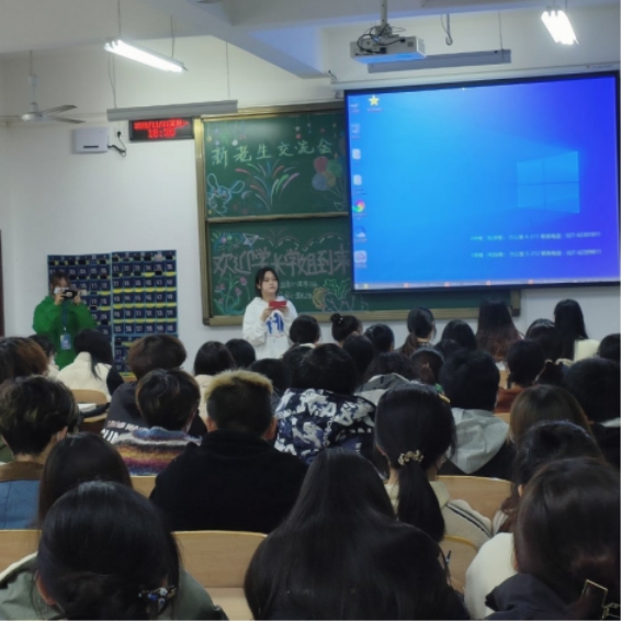 这是新老生交流会的现场,同学们积极的和学长学姐们互动,认真的聆听学姐学长们的建议。
