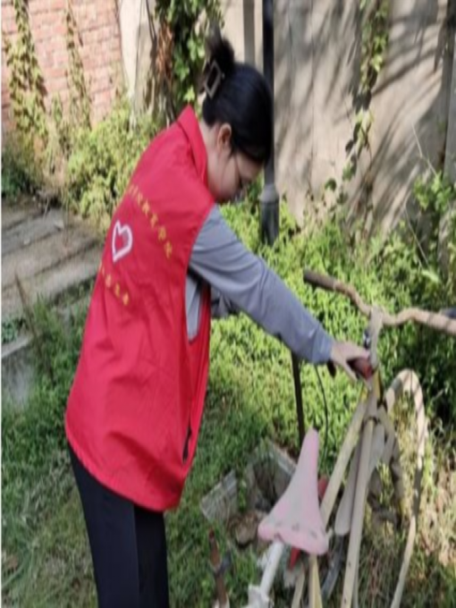 该清理的地方清理干净后,志愿者们开始将乱停乱放的自行车,挪到车棚下面停放着,一位位娇小的身躯,硬是把一辆辆自行车在车棚下面摆的整整齐齐。