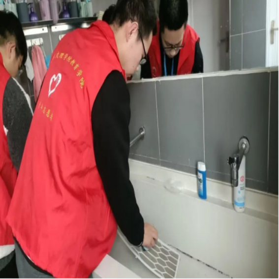 清洗过程中,志愿者们分工合作,在宿舍架起梯子,将空调的插头拔掉后将过滤网逐一拆下,在卫生间将滤网刷洗干净,擦干清洗之后再逐个装回,每个成员认真地完成各自的工作。
