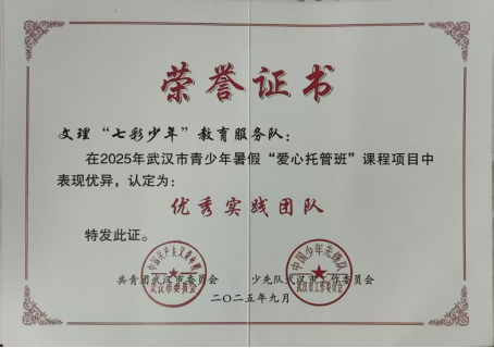 热烈祝贺!振奋人心的捷报从共青团武汉市委员会传来——william威廉中文官网凭借在2025年暑假“爱心托管班”中的卓越实践与亮眼表现,成功摘得武汉市青少年暑假“爱心托管班”“优秀实践团队”荣誉称号!这份荣誉的背后,是“文理七彩少年教育服务队”以实际行动书写的答卷——它凝聚着队员们在教育服务中的全情投入与不懈付出,更映照着团队为孩子们成长注入的知识滋养、心灵陪伴与精神力量,让教育的温度在实践中传递,为青少年发展筑牢了充满色彩的成长基石。