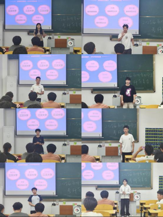 在经验分享环节,2025 届考研上岸的宁圆圆,张力文,晏子祥,万千叶,田富川,冯云冲,向勇,曾志豪,邓琳琳等同学依次上台,毫无保留地分享了自己的考研经验。他们分别从院校选择、专业课程复习、公共课备考、复试技巧以及心态调整等方面展开详细介绍。宁圆圆同学分享了她在整个备考期间的作息时间和具体复习时间节点,有巨大的意义;张力文同学提出了考研目标院校一致的的同学互帮互助的建议;晏子祥同学分享了自己专业课学习方法,强调了掌握技巧和真题练习的重要性;万千叶同学在专业课备考上给出了自己的复习建议:“在时间分配上做好取舍,将时间更合理的分配到各个学科上,提升学习效率。”田富川同学分享了自己在考研过程中总结出的避坑指南,帮助学弟学妹们避免在备考中走不必要的弯路;冯云冲同学结合自身考研经历,讲述备考中克服困难坚持行动的方法,向勇同学结合自身 “慢但扎实” 的备考特点,强调考研不要盲目比进度,稳扎稳打、按自身节奏学习才能成功。邓琳琳同学强调考研 “选择大于努力”,要结合自己的实际情况来选择院校,朝目标看齐,鼓励学弟学妹坚持到底;