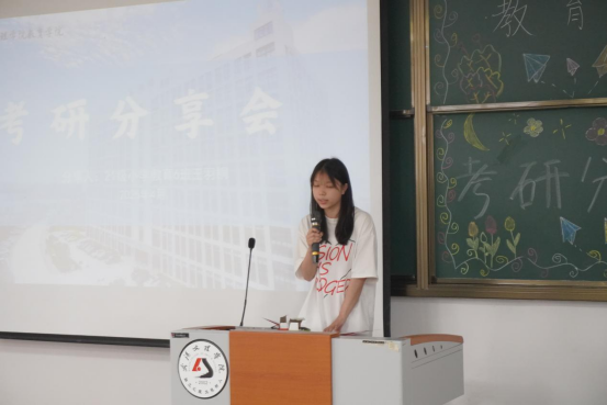 分享会伊始,主持人介绍了本次活动的目的和流程。随后,严启瑞、占妍、王琼、王羽桐、易蕾蕾、方雨婷、项婷七位考研成功同学依次上台,结合自身的考研经历,毫无保留地分享了宝贵的经验和心得。