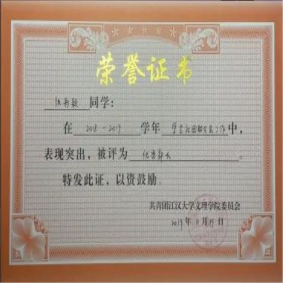 在课余时间我担任过博优教育的小学辅导老师,主要负责给员工们检查各科作业并讲解错题,也参加过本专业的校外幼儿园实习,曾任校社联的宣传部部长,获得了优秀干事与优秀部长的荣誉证书,策划组织了相关大型活动,如校园歌手大赛、社联年度晚会等。