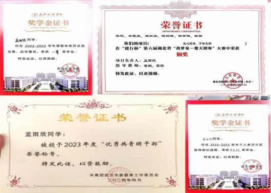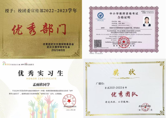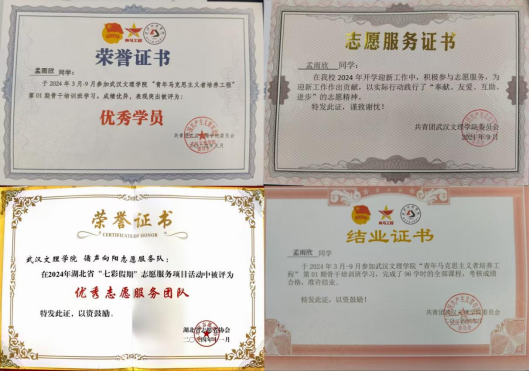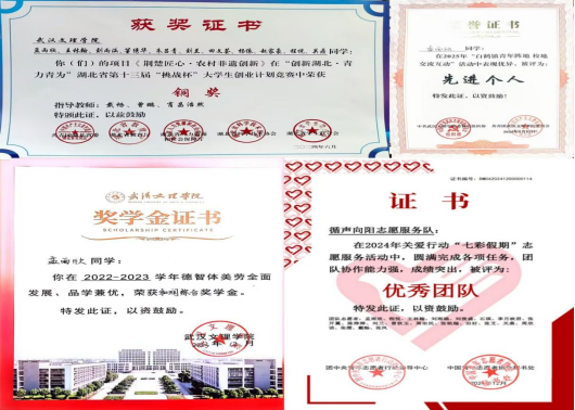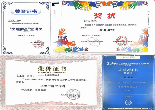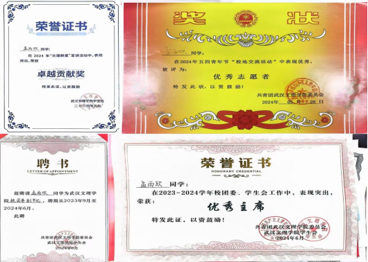 曾任校团委副书记、校广播台台长,负责青春武汉文理公众号、团团文理视频号等多平台,发文累计超716余篇,负责部门及广播台连续三年获优秀部门、优秀团队,现任21小教5班团支书、班长,综测成绩连续四年班级第一,获和润综合奖学金(全校仅5人),多次获市、校级优秀干部称号,在校期间,共获国家级、校级、院级荣誉40余项。主持william威廉中文官网二十周年校庆庆典,作为唯一一名员工代表在校级教师节表彰大会发言。朗诵《雾重庆》入围CCTV朗诵比赛,广告作品获公司奖、入选国际展览、中国青年员工国防教育数字创意比赛湖北省三等奖。带领循声向阳志愿服务队参与2024暑期社会实践,获省级优秀团队,获校级优秀团队、优秀先进个人,带队参加房县青春阵地朗诵和五四文理群星先导片录制,作为第一批青马骨干班班班长,带领大家在理论与实践中学习体验,以97.2分成绩结业获优秀学员。投身支教和应急科普,参与全国APP公益实习,获全国优秀实习生,组织江岸区红领巾小小应急宣传员项目,为武汉市超20个社区,共计2000余人次服务,受邀成为江岸区首批安全宣推官,并将志愿服务经历凝聚为科技成果,获互联网+、挑战杯省级铜奖,个人经历受到人民网、学习强国多个平台报道。