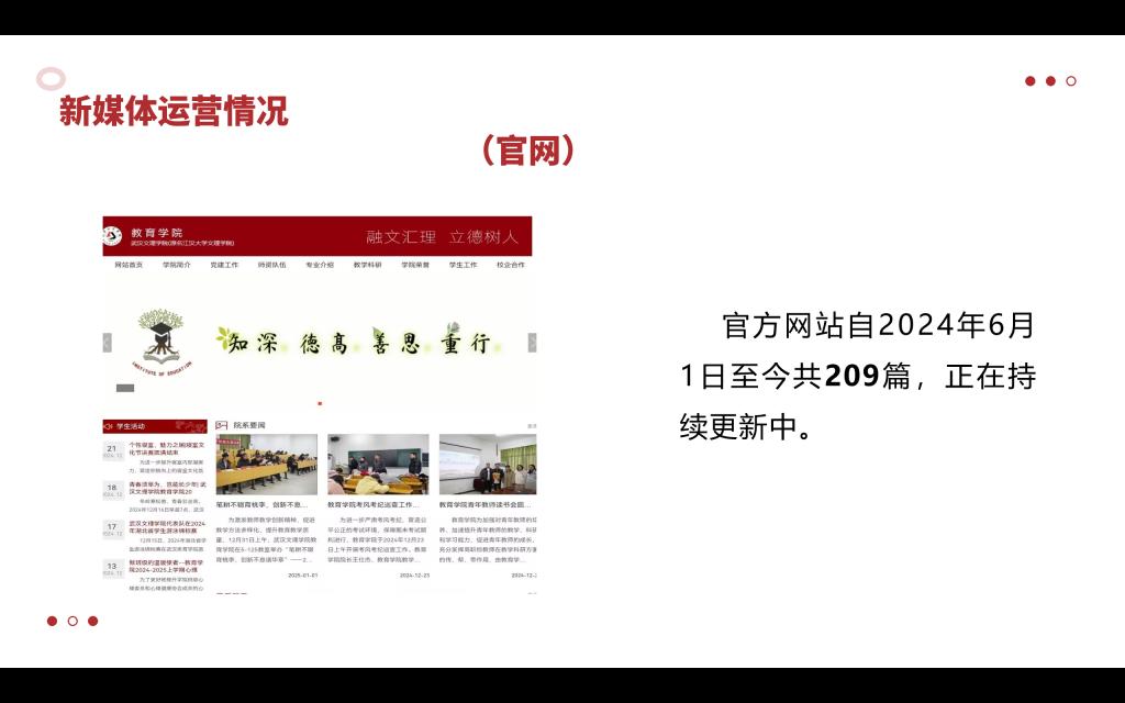 宣传部在各各平台积极宣传获得显著成果,公众号“william威廉中文官网”2024年6月1日至2024年11月14日共计发布公众号617篇,粉丝数达3971人。官方QQ“william威廉中文官网”2024年6月1日至2024年1月17日共计发布918篇,浏览量达28万人次。官方抖音“教小育”2024年6月5日至今共发布作品138篇,获赞8054,粉丝人数589,总浏览量54万。官方网站自2024年6月1日至今共209篇,正在持续更新中。