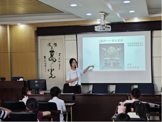 “同学们,你们知道古代的交响乐是用什么乐器演奏的吗?”课堂伊始,授课教师以一个有趣的问题引发孩子们的好奇。随着投影幕布上出现编钟的图片,教师向大家介绍了编钟的历史地位,以及“大音低频、小音高频”的发声原理,对编钟的构造与用途进行了说明,还延伸展示了青铜尊盘、虎坐鸟架鼓、古筝等其他古代乐器与器物。随后借助动画短片,孩子们看到了古人在祭祀、宴饮等场合演奏编钟的场景,明白了编钟所蕴含的礼乐文化。