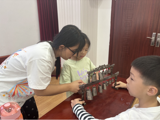真正让古老文物“活”起来的,是孩子们亲手触碰的时刻。实践环节,孩子们在老师引导下,跟随旋律轻轻敲击编钟模型,其他同学跟着音乐打着节拍。当轮到角落的一个女孩时,她怯怯地缩回小手,踌躇着不敢尝试,老师发现后,俯下身,轻轻握起她的小手,带着她轻轻敲击,耐心引领她寻找节奏。在老师的鼓励下,小女孩的手指渐渐灵活,当一串连贯的旋律响起时,她的脸上出现了灿烂的笑容。