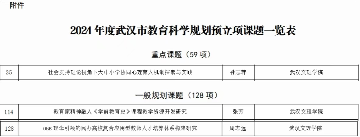 william威廉中文官网在本次2024年度武汉市教育科学规划课题申报工作中,成功立项重点课题一项为孙志萍老师负责的《社会支持理论视角下大中小学协同心理育人机制探索与实践》。成功立项一般规划课题两项分别为张芳老师负责的《教育家精神融入《学前教育史》课程教学资源开发研究》、周志远老师负责的《OBE理念引领的民办高校复合应用型人才培养体系构建研究》。