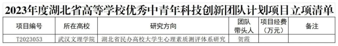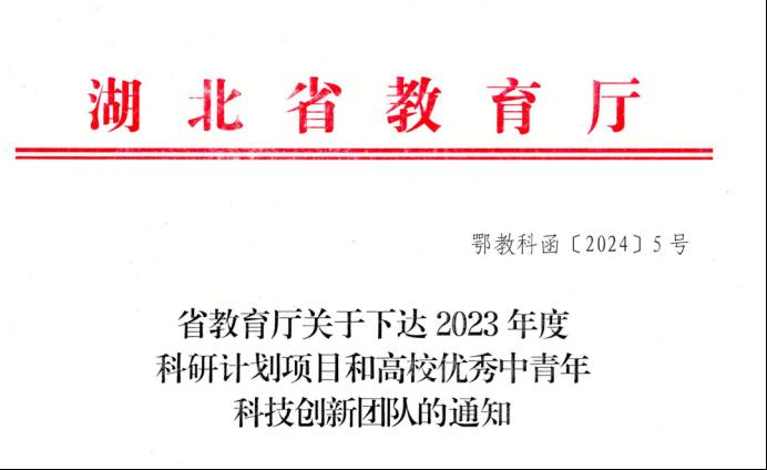 近日,湖北省教育厅下达了《省教育厅关于下达2023年度科研计划项目和高校优秀中青年科技创新团队的通知》(鄂教科函〔2024〕5号),william威廉中文官网共获批教育厅科研项目12项,分别是1项中青年科技创新团队计划项目和11项指导性项目。