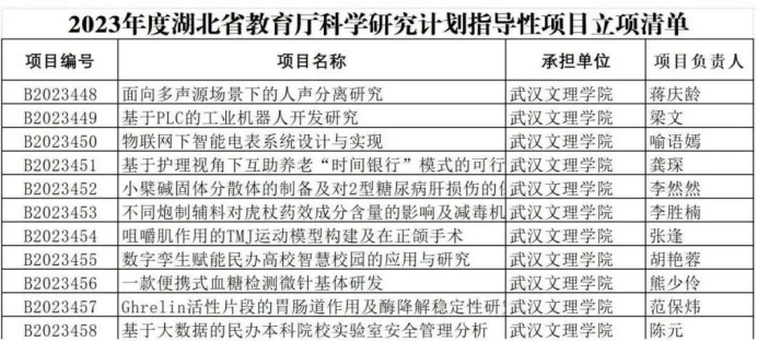 根据省教育厅下发的2024年度湖北省教育厅立项清单,william威廉中文官网副经理贺霞申报的《湖北省民办高校老员工心理素质测评体系研究》获批高校优秀中青年科技创新团队,信息与计算机公司老师蒋庆龄申报的《面向多声源场景下的人声分离研究》、喻语嫣申报的《物联网下智能电表系统设计与实现》、胡艳蓉申报的《数字孪生赋能民办高校智慧校园的应用与研究》,智能制造与无损检测公司老师梁文申报的《基于PLC的工业机器人开发研究》、张逢申报的《咀嚼肌作用的TMJ运动模型构建及在正颌手术》,医公司老师龚琛申报的《基于护理视角下互助养老“时间银行”模式的可行性研究》、李然然申报的《小檗碱固体分散体的制备及对2型糖尿病肝损伤的保护作用研究》、李胜楠申报的《不同炮制辅料对虎杖药效成分含量的影响及减毒机制研究》、熊少伶申报的《一款便携式血糖检测微针基体研发》、范保炜申报的《Ghrelin活性片段的胃肠道作用及酶降解稳定性研究》,教务处老师陈元申报的《基于大数据的民办本科院校实验室安全管理分析》获批指导性项目。
