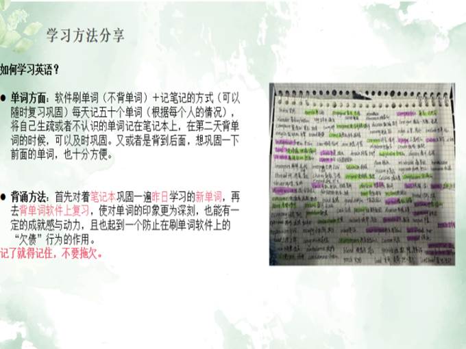 杜禹番同学的分享涵盖四大维度,层层递进,为同学们勾勒出一幅清晰的专升本备考蓝图。于专升本介绍部分,详细阐释了解专业与院校信息的重要性,提醒同学们在选择时需谨慎,毕竟每个考生仅有一次填报一所高校本科专业的机会,精准定位是迈向成功的首要步骤。谈及如何学习,其提出的四个步骤犹如学习路上的导航仪:首先,确定目标时,要深入探究目标公司往年专业课详情与出题风格,做到知己知彼;其次,制定计划环节,要将大目标拆解为小目标,长计划细化为短安排,有条不紊地构建学习路径;再者,实施与修改计划过程中,持续探索最契合自身的高效学习模式,犹如工匠雕琢美玉,不断打磨,以求学习效益的最大化;最后,总结学习成果,查漏补缺加以完善,对所学知识进行全面梳理与巩固,为知识大厦筑牢根基。在学习方法经验上,针对英语学习,着重强调单词积累与重要知识点背诵,专业课学习则倡导理解、背诵和运用,巧用思维导图构建知识框架,使复杂的知识体系一目了然,便于记忆与运用。而情绪调节与总结方面,更是为同学们提供了一份心灵调适的指南,鼓励大家摒弃自责,拥抱自信,学会转移和化解负面情绪,以沉着冷静、积极乐观的心态应对备考压力,同时倡导选择适合自己的学习方法,实现高效学习。